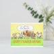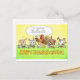 This card shows the drawing of a thanksgiving dinner. The guests are a turkey and four bunnies. The turkey is sitting in the middle. It is raising its glass to make a speech or a toast. Over it is a speech bubble that reads "I'm grateful you are all vegetarians." The bunnies are eating. On their plates you can see carrots, corn and mashed potatoes. The tablecloth is green. On it is written "Happy ThanksGiving".