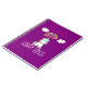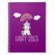 A spiral notebook with a cute illustration of a white unicorn sitting on its rump smiling and looking happy. Smiling clouds and a rainbow overhead. Text says: Happy Vibes. Adorable uplifting image. Set on a pinkish purple watercolor background.