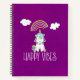 A notebook with a cute illustration of a white unicorn sitting on its rump smiling and looking happy. Smiling clouds and a rainbow overhead. Text says: Happy Vibes. Adorable uplifting image. Set on a pinkish purple watercolor background.