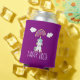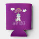 A can cooler cozie with an adorable drawing of an awesome unicorn sitting on its butt peaceful and happy. Cute fluffy clouds and a colourful rainbow above. Text says: Happy Vibes. Awesome positivity. Set on a pinkish purple watercolor background.