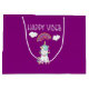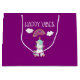 A gift bag with an adorable drawing of an awesome unicorn sitting on its butt peaceful and happy. Cute fluffy clouds and a colourful rainbow above. Text says: Happy Vibes. Awesome positivity. Set on a pinkish purple background.