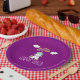 Paper plates with an adorable drawing of an awesome unicorn sitting on its butt peaceful and happy. Cute fluffy clouds and a colourful rainbow above. Text says: Happy Vibes. Awesome positivity. Set on a pinkish purple watercolor background.