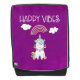 A backpack with a cute illustration of a white unicorn sitting on its rump smiling and looking happy. Smiling clouds and a rainbow overhead. Text says: Happy Vibes. Adorable uplifting image. With a pinkish purple watercolor background.