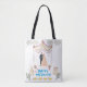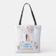 "Celebrate love and new beginnings with this Happy Wedding Tote Bag featuring a clean white background, showcasing a romantic art design of a joyful wedding couple beneath an elegant wedding gate, surrounded by beautiful flowers and celebratory cakes.
