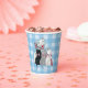 These paper cups are blue and white plaid pattern with a white happy mother cat sitting with her three little kittens which are black, grey, and white all wearing pink bows on their necks.