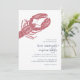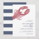 Coastal chic wedding invitation features a vintage etched style lobster illustration in muted red, with your wedding details in classic navy blue. Perfect for beach, summer, or nautical weddings, these coastal style wedding invitations reverse to wide blue and white stripes.