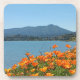 California poppies and calm blue water sparkles in the foreground with a view Tiburon hillside along its shores, backed by Mt Tamalpais under a clear blue sky. California poppies decorate the foreground, adding a touch of wildflowers to the tranquil scene.