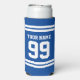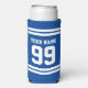 Hard seltzer can coolers with sports jersey number. Athletic stripe design with custom name. Blue or custom colour. Cool gifts and party accessories for sports fans, football players, coach etc. Double sided print. Personalise with your text.