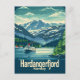 A breathtaking and nostalgic depiction of Hardangerfjord, Norway's second-longest fjord, celebrated for its dramatic landscapes and natural beauty. The design captures the fjord's majestic cliffs towering over deep blue waters, adorned with cascading waterfalls and lush green orchards during spring bloom. Rendered in a vintage style, the artwork evokes the serene atmosphere and awe-inspiring vistas of Hardangerfjord, inviting viewers to explore its pristine wilderness and scenic charm.
