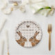 Personalizable wedding paper plates featuring a beige gingham background with two brown watercolor hare heads facing each other. The design includes space at the top for the couple’s names along with a separate personalizable area for the wedding date accented by a brown heart silhouette. A lovely choice for rustic, countryside, woodland or spring wedding or engagement celebrations.