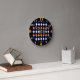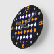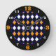Orange diamonds with blue borders highlight this bold black & white harlequin wall clock.