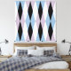 A mid-century inspired design featuring a harlequin diamond pattern in blue, dusty lilac, black and white.