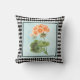 Pretty throw pillow features a Geranium flower botanical style illustration on distressed light denim background with black and white harlequin pattern frame.
