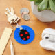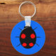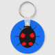 A blue keychain featuring a black harlequin ladybird with four irregular shaped red spots on its back, six legs and two white spots that look like eyes on the front of its head. Originally an Asian species it is now living and breeding in Europe and America. It has been put on a blue background but also looks great against other colour backgrounds. You can change the background colour and other aspects of the design by clicking on the customise it button.