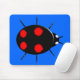 A mousepad featuring a black harlequin ladybird with four irregular shaped red spots on its back, six legs and two white spots that look like eyes on the front of its head. Originally an Asian species it is now living and breeding in Europe and America. It has been put on a blue background but also looks great against other colour backgrounds. You can change the background colour and other aspects of the design by clicking on the customise it button.