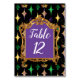 Whether you are celebrating the Mardi Gras festival or a Mardi Gras themed Bridal Shower, Bachelorette Party, Birthday Party or other occasion, this elegant themed design will dress your table in jazzy, Mardi Gras style. Features harlequins, masks, beads and fleur de lis symbols arranged in a patterned background on black (colour can be changed via "customise") and an elaborate gold tone frame surrounding a purple background to highlight your table numbers. Composite design by Holiday Hearts Designs (rights reserved).