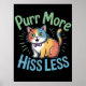 This charming graphic features a cheerful cartoon cat with striking colour-blocked fur in blue, orange, and white patches, sporting a purple bow tie. The cat has wide, expressive green eyes and a happy, open-mouthed smile. The text, "Purr More Hiss Less," is presented in two distinct colours: "Purr More" in green and "Hiss Less" in light blue, advocating for a positive feline temperament. The design is set against a solid black background. Digital download for personal use only.