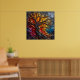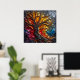 An abstract portrait of a withered tree set against a textured medium grey background. The roots, trunk, and branches stretch in opposite directions, infused with vibrant colours—shades of blood red, burgundy, blue, turquoise, orange, and yellow. Abstract lines in golden and dark brown create an engaging and artistic composition, capturing the beauty within the decay.