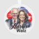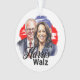 Democrat Christmas ornament in support of Kamala Harris and Tim Walz for president and vice president in 2024 US presidential election. Red, white and blue patriotic background.