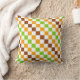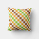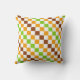 A vibrant chequered pattern of alternating green, orange, and brown squares on a white background. The design creates a lively, geometric feel.
