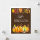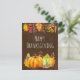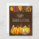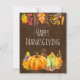 A Happy Thanksgiving holiday card with a watercolor illustration of pumpkins, acorns, mushrooms and seasonal autumn leaves.