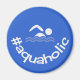 A single pictogram swimmer and the caption #aquaholic make this a fun magnet for anyone who loves swimming and other water sports. In a light silvery grey on a bright blue background. Circle or square options available.