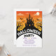 A classic Halloween invitation featuring a haunted castle, twisted trees, and flying bats for a spooky night.