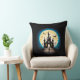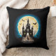Introducing our bewitching Halloween-themed throw pillow that will transform your living space into a haunted realm of eerie enchantment. Against a captivating black background, this pillow showcases a hauntingly beautiful design of a majestic haunted castle, silhouetted against a huge full moon. The sky is a stunning combination of turquoise blue and grey, creating an atmosphere of mystery and intrigue. Barren tree branches, bats, spiders, and creepy faces add an extra touch of spine-chilling detail to the scene.