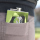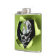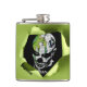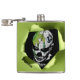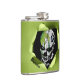 Green flask, with graphics of a ripped hole, in the middle, and a creepy black and white clown face peeking out. Personalise the black text to suit your needs.