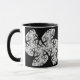 This haunting mug design was created from a fractal. It resembles a cluster of black trees with black trunks and twisted branches against a white moonlit night sky. It looks as though you are lying on the ground looking up at the sky from within a dense and spooky forest. Let your imagination run wild. A ringer style mug is shown here but the design is also available on other styles of mug including travel mugs and frosted glass mugs.