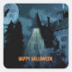Halloween themed design features artistic digital painting of scary haunted Gothic mansion on the hill with dark blue and grey skies. Customisable grunge style orange text overlay