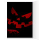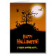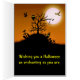 A scary haunted grave yard scene with an owl perched in a spooky tree that also has a hangman's noose hanging from it. The background is a orange sky and there's a full moon with bats flying across it. Very fun and scary design for your Halloween greeting card.