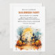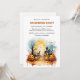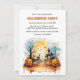 Halloween party invitation featuring a watercolor illustration of a haunted graveyard, jack-o-lanterns and bats.