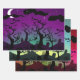 Haunted graveyard Halloween wrapping paper sheets. A haunted cemetery with gravestones, spooky trees, a witch, an owl and bats are the elements of this cool Halloween design. The first sheet ar purple and aqua, the second in aqua and yellow and the third in red and olive green colours.