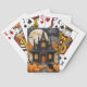 A spooky silhouette of a haunted house stands against a vibrant, full moon. Bare, gnarled trees reach like skeletal fingers toward the sky, while glowing jack-o'-lanterns dot the yard. A black cat, a familiar spirit of the season, sits in the foreground, its eyes reflecting the eerie light. The artwork is dominated by a striking black and orange color palette, perfect for setting a classic Halloween mood.