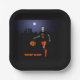 Not into trick-or-treating on Halloween? How 'bout a little pickup game of hoops? Features a skeleton dribbling a Jack O'Lantern in pace of a basketball. The skeleton is wearing a t-shirt emblazoned with the number "7" and team name "GHOULS." The moon hovers over a dark city skyline in the distance. Customise by adding your own text.