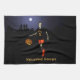 Not into trick-or-treating on Halloween?  How 'bout a little pickup game of hoops?  Features a skeleton dribbling a Jack O'Lantern in pace of a basketball.  The skeleton is wearing a t-shirt emblazoned with the number "7" and team name "GHOULS." The moon hovers over a dark city skyline in the distance. Text reading "Haunted Hoops" also appears in orange.
