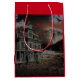 Creepy haunted house with red distressed lettering "Happy Halloween". Background colour is...bloody red. Yikes!