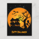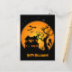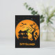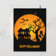 A haunted house, a spooky tree, ghosts and bats in an orange circle on black background.