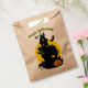 Fun Halloween trick or treat bag with a haunted house which has a belfry with bats flying around it. A scary black cat and a carved jack-o-lantern in the front yard and a full moon in the background. Arched over the top in bold bright green lettering is Happy Halloween.