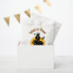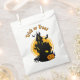 Fun Halloween trick or treat bag with a haunted house which has a belfry with bats flying around it. A scary black cat and a carved jack-o-lantern in the front yard and a full moon in the background. Arched over the top in bold orange lettering is Trick or Treat.