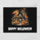 Halloween postcard with a cool and spooky illustration of a wooden haunted house. Surrounded by big orange pumpkins and trees with orange leaves. Windows with orange lights add a nice glow. Fun Halloween design.