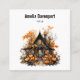 Business cards with a cool and spooky illustration of a wooden haunted house. Surrounded by big orange pumpkins and trees with orange leaves. Windows with orange lights add a nice glow. Fun Halloween design.