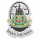 This is a cute sticker design made of a green jack-o-lantern figure, a haunted mansion, spooky monsters, and bats. You can customise the default "happy halloween" text.