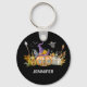 A key chain with a cute image of a haunted pumpkin house with a big witches hat on top and ghosts and bats flying around.