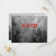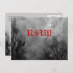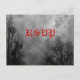 A custom RSVP postcard with a background of a spooky Halloween sky with misty trees along a dark haunted road, gothic ravens and a cloudy full moon. The front has RSVP in a red gothic fonts, the back has room for your custom dates and return address.