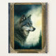 This haunting wolf peers out from a moonlit night. AI assisted graphic purchased with commercial use. Artwork: RavenPrintableDesign