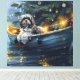 Set sail into the magic of the holiday season with this beautifully detailed illustration, showcasing a proud dog sitting in a festively decorated boat, gliding across a serene Christmas lake. The twinkling lights from nearby pine trees reflect off the water, casting a warm, festive glow that enhances the cosy ambiance. Ornaments dangle from the boat's sides, while glowing lanterns light the way, creating a scene that captures the true essence of Christmas warmth and joy. This nostalgic artwork brings a touch of holiday magic to any space, perfect for those who cherish the spirit of the season.