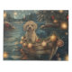 Set sail into the magic of the holiday season with this beautifully detailed illustration, showcasing a proud dog sitting in a festively decorated boat, gliding across a serene Christmas lake. The twinkling lights from nearby pine trees reflect off the water, casting a warm, festive glow that enhances the cosy ambiance. Ornaments dangle from the boat's sides, while glowing lanterns light the way, creating a scene that captures the true essence of Christmas warmth and joy. This nostalgic artwork brings a touch of holiday magic to any space, perfect for those who cherish the spirit of the season.