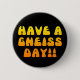 Have A Gneiss Day!! - geology humour button pin in black with yellow-orange lettering.